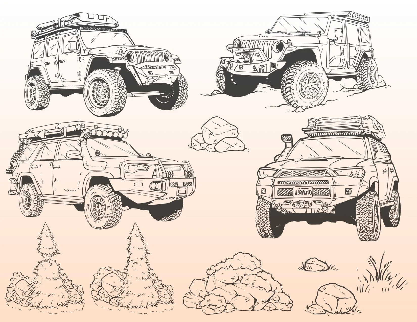 My research began with finding the most common cars used for Off-Roading, followed by drawing them, along with extras.